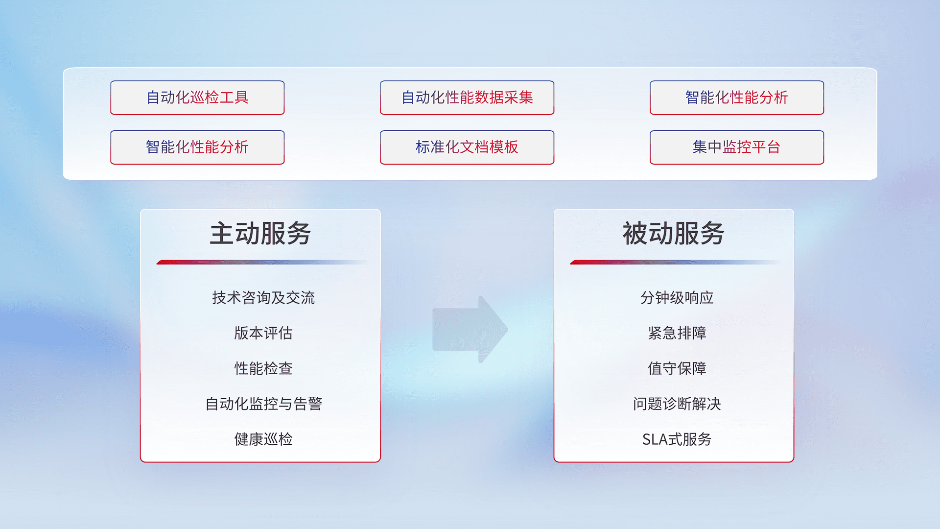智能化工具和标准化文档,,保障服务质量,,提供主动服务(包含技术咨询、、版本评估、、、、性能检查、、、自动化监控与告警、、健康巡检)和被动服务包含(分钟级响应、、、、紧急排障、、、、值守保障、、问题诊断解决、、、、SLA服务)。。